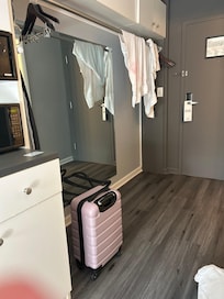 Front desk staff was a 10. But the room is smaller than my kitchen at home and the tv barely worked . The sink and toilet had poor plumbing and the shower was like showering in a shoe box . Parking was ok . The staff made the stay a great one otherwise it’s not built for big people